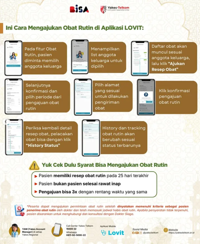 Agar libur Lebaran tetap aman dan nyaman tanpa khawatir kehabisan obat, kini peserta Yakes Telkom dapat mengajukan permintaan obat rutin dengan lebih mudah melalui aplikasi LOVIT. Prosesnya praktis dan bisa dilakukan langsung dari ponsel, tanpa perlu datang ke fasilitas kesehatan.