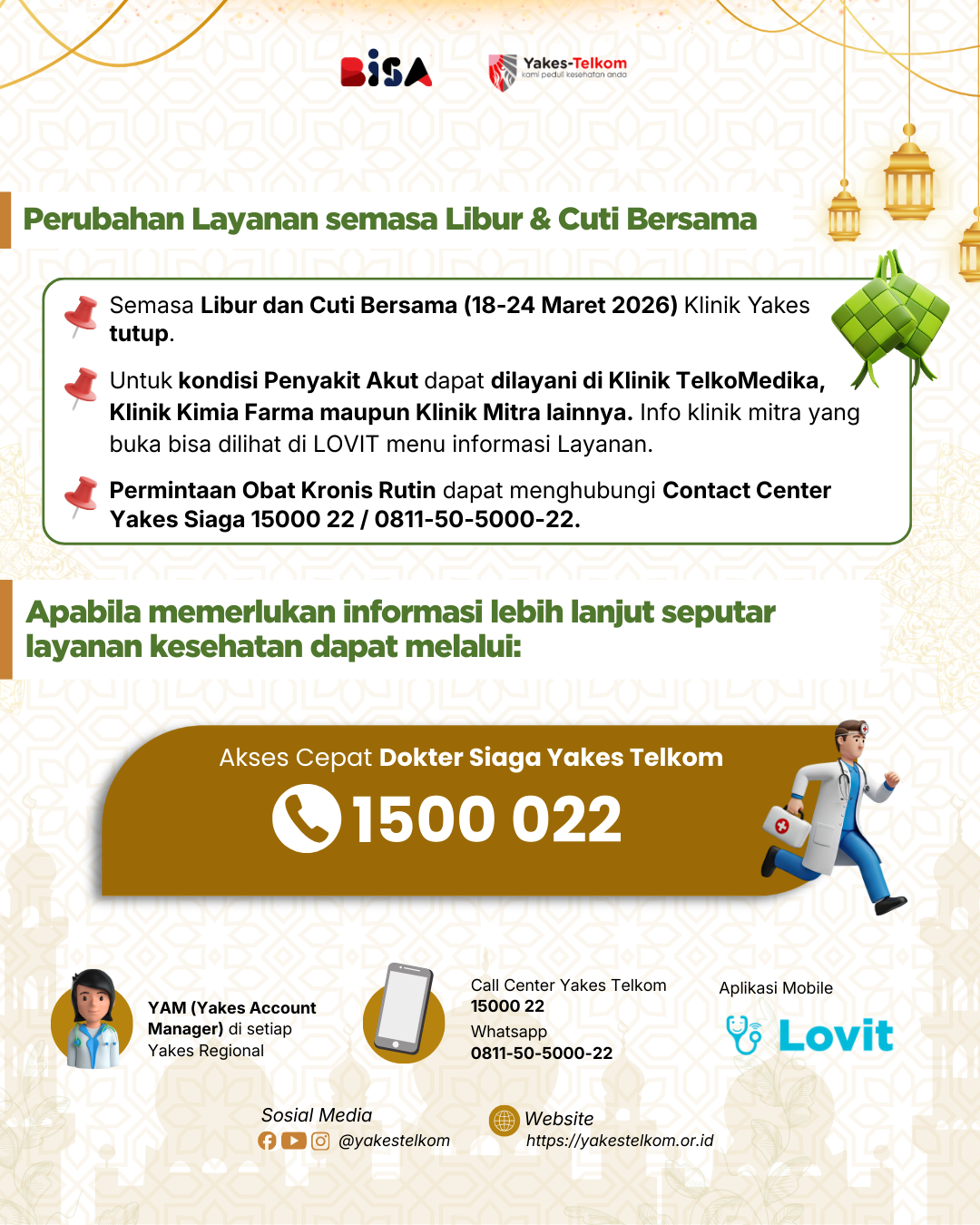 Selama Libur & Cuti Bersama (18–24 Maret 2026), Klinik Yakes Telkom tidak beroperasi sementara. Namun, peserta tetap bisa mendapatkan layanan kesehatan melalui beberapa alternatif berikut: