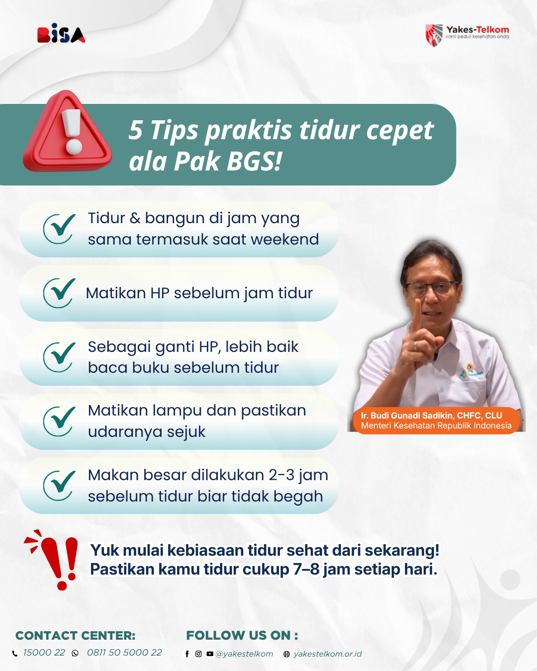 Ingat, kebutuhan tidur ideal orang dewasa adalah sekitar 7–8 jam setiap hari. Mulai dari sekarang, perbaiki pola tidurmu untuk hidup yang lebih sehat dan berkualitas!