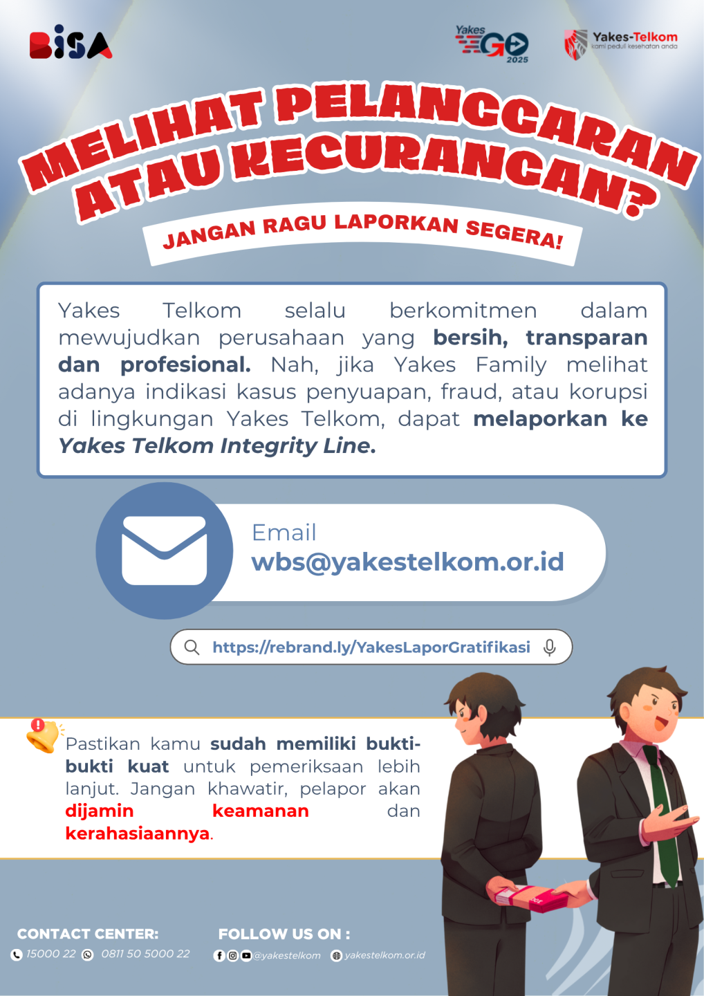 Melalui WBS, Yakes Telkom memberikan ruang yang aman bagi setiap insan organisasi dan pemangku kepentingan untuk berani bersuara dan bertindak demi mencegah, mendeteksi, serta menangani perilaku yang menyimpang dari nilai dan ketentuan yang berlaku.